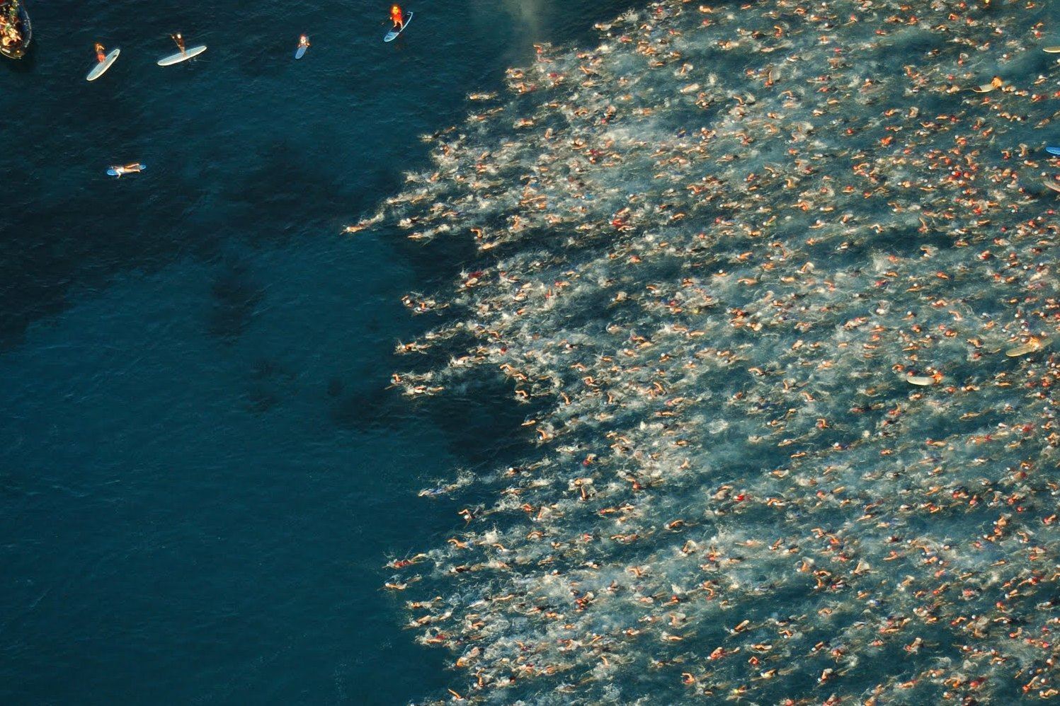 Es ist noch sehr früh und ich bin bereits fertig. Ich lasse mir noch den Rücken eincremen. Danach noch einmal kurz zum Rad und schauen, dass alles in Ordnung ist. Inzwischen habe ich etwas hunger, Walter ist so freundlich und überlässt mir einen Riegel. Um 6:30 Uhr fällt dann der Startschuss für die Profis. Jetzt haben wir noch 30 Minuten Zeit. Wir gehen schon langsam zum Wasser und stellen uns unten hin. Einige schwimmen sich bereits ein. Das muss ich so früh noch nicht machen. 30 Minuten sind eine lange Zeit. Um 6:45 Uhr fange ich dann auch an in Richtung Startlinie zu schwimmen. Es werden immer mehr Leute, teilweise ist es im Wasser ganz schön eng. Die Minuten ziehen sich. Dann endlich, der Startschuss fällt. Es ist nicht möglich sofort zu schwimmen da sich alles noch etwas staut. Die vorderen Reihen müssen zuerst einmal wegkommen, dann können wir langsam auch anfangen. Die ersten 500 Meter sind ein ganz schönes Gedränge. Ich versuche mich aus allem rauszuhalten. Wenn es zu eng wird mache ich lieber mal langsam bevor ich einen Tritt oder Schlag abbekomme. Nach und nach reguliert sich alles. Es kommt nur noch ab- und an vor, dass es mal eng wird. Ansonsten kann man einigermaßen schwimmen. Ich versuche mich auf die Athleten zu konzentrieren und ignoriere meine Übelkeit. Das Meer und die Wellen sind nicht mein Ding. Vor mir schwimmt einer ohne Beine, das ist sehr beeindruckend. An der Wendeboje wird es etwas eng, dummerweise bin ich auch noch an der Innenseite. Aber irgendwie geht es um die Kurve und dann geht es normal weiter. Inzwischen habe ich etwas die Orientierung verloren. Ich habe Probleme bei den Wellen die Bojen zu erkennen. Aber solange noch Leute um mich sind, kann ich ja nicht so falsch schwimmen. Ich habe kein Gefühl wie lange die Strecke noch ist,