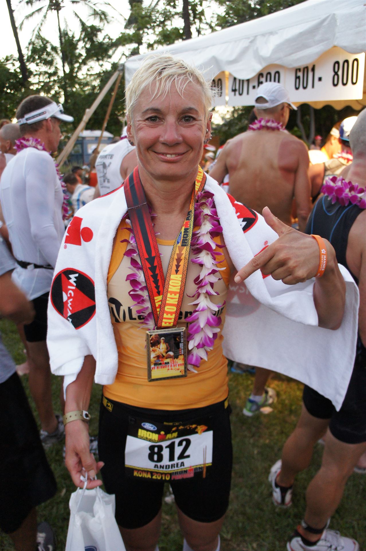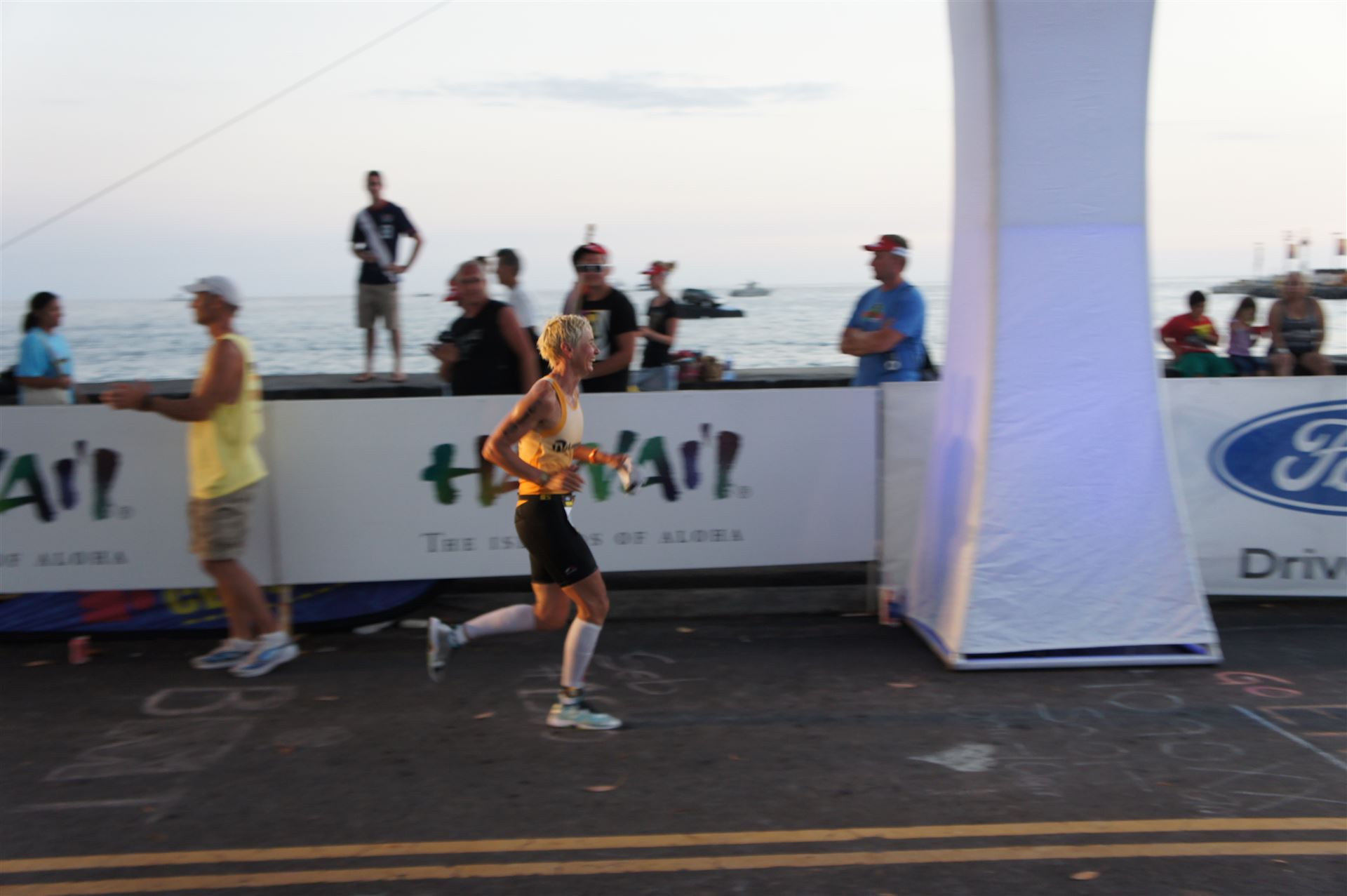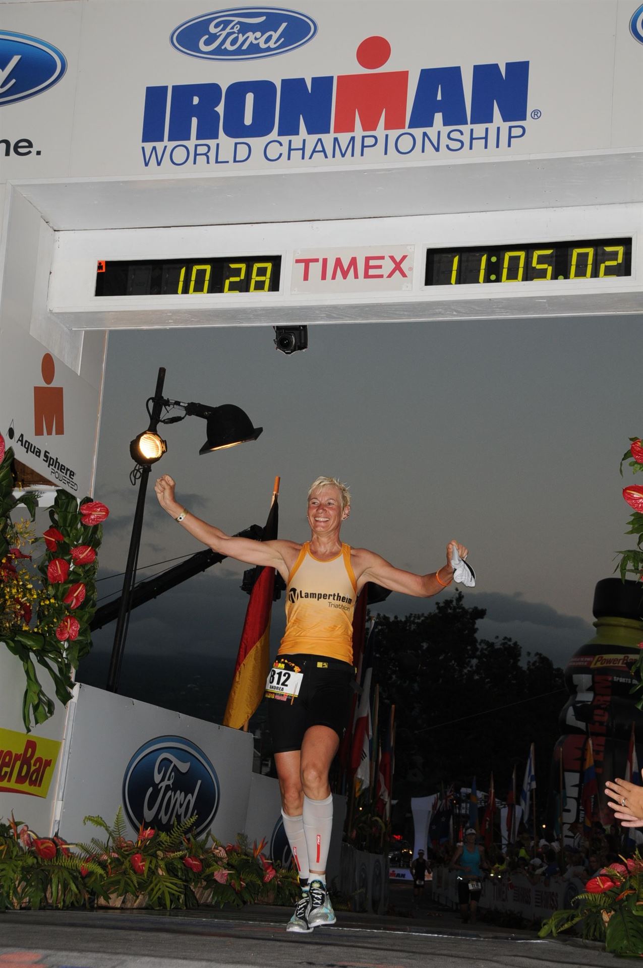 Aufgrund der Wärme, die Sonne strahlt unbarmherzig beschließe ich, nicht am Limit zu laufen. Da ich nicht weiß, wie mein Körper das Klima verkraftet, gehe ich lieber auf Nummer sicher. Ich wähle ein für mich angenehmes Tempo und laufe nun von Verpflegungsstelle zu Verpflegungsstelle. An jeder Verpflegung halte ich an und trinke etwas, ich denke das ist sehr wichtig für den Körper. Ansonsten nehme ich alle greifbaren Schwämme und fülle mir Eiswürfel unter die Mütze. Diese leichte Abkühlung ist eine Wohltat. Irgendwann komme ich auf die Idee und schütte die Eiswürfel ebenfalls in mein Trikot. Bei jedem Schritt macht das Eis lustige Geräusche. Auf der Laufstrecke in Kona sind relativ viele Leute am Straßenrand. Viele rufen die Startnummer und feuern mich an. Ich kann jeden Meter dieses Laufes genießen. Ich fühle mich vom ersten Meter an gut und bin auch zuversichtlich, dass ich ins Ziel komme. Dann geht es auf den Highway. Hier gibt es keinerlei Schatten mehr, der Asphalt strahlt die Hitze ab. Jetzt muss ich „nur“ noch bis zum Energy Lab und wieder zurücklaufen. Das sind nur noch ca. 17 Meilen. Aber es stört mich in keinster Weise. Ich freue mich, winke den Zuschauern zu und versuche möglichst viele Leute zu überholen. Mein Magen fängt leider an etwas zu rebellieren, daher trinke ist vorerst fast nichts und kühle nur von außen. Ich hoffe, das geht vorüber. Während ich raus laufe kommen mir auch viele Leute entgegen. Einige gehen, sie können nicht mehr laufen. Manche Athleten, die ich überhole, rufen mir zu „good job“ das finde ich super nett. Unterwegs steht auch Hannes mit seinen Leuten und machen Party. Da läuft man gleich wieder viel leichter. Dann kommt die Abbiegung zum Energy Lab. Hier ist auch eine tolle Stimmung. Es ist jedoch noch ein langes Stück zum Meer und dann geht es noch einmal rechts ab. Am Wendepunkt stehen 3-4 Männer und feuern die Leute an. Ich tanze etwas mit ihnen und jubel ihnen zu, die freuen sich total. So, jetzt heißt es nur noch zurücklaufen. Nur noch, es sind sicherlich noch 12-13 km. Aber was ist das schon. Mir geht es gut ich fühl mich sauwohl. Wieder auf dem Highway angelangt läuft mir Walter entgegen. Es geht ihm ebenfalls gut er winkt und ruft mir zu. Jetzt habe ich das Gefühl ich bin auf dem Heimweg. Bei den Verpflegungsstellen stehen sie inzwischen mit großen kalten Wasserflaschen da und fragen, ob sie einem Wasser über den Kopf schütten sollen. Ich bin dankbar für jede Abkühlung und sage nicht nein. Vor mir läuft ein junger Mann, auf einmal bleibt er stehen, die Beine ganz starr. Er hat einen furchtbaren Krampf. Ich frage ihn, ob ich ihm helfen kann, er winkt jedoch nur ab und sagt, ich soll weiterlaufen. Die Strecke zurück zieht sich dann doch noch. Ich halte noch immer an jeder Verpflegungsstelle an, ich gehe auf Nummer sicher. Unterwegs hatte mal mein rechter Oberschenkel etwas weh getan, aber das ging irgendwie wieder weg. Ein Radfahrer fährt ein Stück auf dem Highway neben mir her und ruft Lampertheim Go. Es ist ein Deutscher der mich anfeuert. Er meinte ich wäre sicherlich ein Daylight Finisher. Ich rufe ihm zu, dass ich keine Ahnung habe, da ich keine Uhr dabei habe. Er meinte nur, du bist sicherlich noch bei Tageslicht im Ziel. Auf dem letzten Stück habe ich eine Frau ca. in meinem Alter überholt. Sie hat mir zugerufen „good job“ und sich an mich drangehängt. Wir sind dann eine ganz Zeit zusammen gelaufen. Das fand ich sehr angenehm. Irgendwann hat sie abreißen lassen, ich hab dann etwas langsam gemacht und gesagt, sie solle doch mit weiterlaufen. Sie meinte dann, nein sie kann nicht mehr so schnell und dann bedankte sie sich noch, dass ich sie mitgezogen habe. Dann kommt lediglich noch ein Anstieg auf dem Highway, wobei man inzwischen jeden Höhenmeter in den Knochen merkt. Wieder in Kona angekommen geht es nur noch die Palani Road runter. Abwärts laufen ist inzwischen auch nicht mehr so angenehm. Jetzt noch ein Quadrat laufen. Hier überhole ich noch einige. Es sitzen noch immer viele Zuschauer am Straßenrand und rufen einem zu, dass man gleich im Ziel ist. Auf dem Ali Drive nehme ich Tempo raus und genieße jeden Meter. Ganz viele Leute jubeln mit zu, rufen meine Startnummer oder meinen Namen und klatschen mich ab. Das Gefühl ist unbeschreiblich. Inzwischen kann ich hören, wie der Sprecher bereits meinen Namen, Nation…..und ähnliches ruft. Jetzt sind es nur noch ein paar Meter und ich bin im Ziel. Es geht mir super gut und ich weiß schon jetzt, dass wenn ich die Möglichkeit habe, wieder nach Hawaii kommen werde. Im Ziel bekommt man Blumen und ein Handtuch umgehängt. Eine Betreuerin kümmert sich um mich und führt mich nach hinten. Ich sage ihr, dass es mir gut geht und ich nach meinem Mann suche. Sie fragt mich noch mehrmals ob alles in Ordnung ist bevor sie mich alleine lässt. In der Menge erkenne ich dann auch schon Werner. Er ist super stolz auf mich. Erstaunlicherweise habe ich sofort Lust auf Cola und Pizza. Was ich dann auch in mich rein stopfe. Ich hole noch mein Finisher Shirt und meine Urkunde ab. Zum Nachtisch esse ich noch Vanille-Eis. Das einzige was mir weh tut sind die Füße. Durch die nassen Schuhe und Strümpfe (es war ja alles klatsch nass, da ich ja ständig Wasser über mich geschüttet habe) habe ich mir einige Blasen sogar auf den Fußsohlen gelaufen. Ich lasse noch ein Foto mit der Medaille machen und ein Foto noch zusammen mit Werner. Nach und nach kommen Walter und Ulla ins Ziel. Es geht beiden auch sehr gut. Wir lassen noch ein Foto von uns dreien machen. Dann holen wir unsere Sachen und fahren mit den Rädern zurück ins Hotel. Es war ein unvergesslicher Tag.
