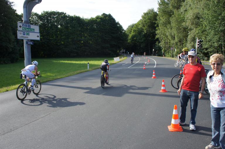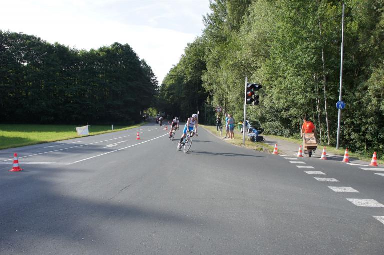 Auf der ersten Runde sind relativ viele Triathleten unterwegs. Es ist mitunter nicht so einfach, keinen Windschatten des Vordermannes zu nutzen. In der 2. Runde hat sich das Feld etwas auseinander gezogen, so dass man etwas entspannter fahren kann.