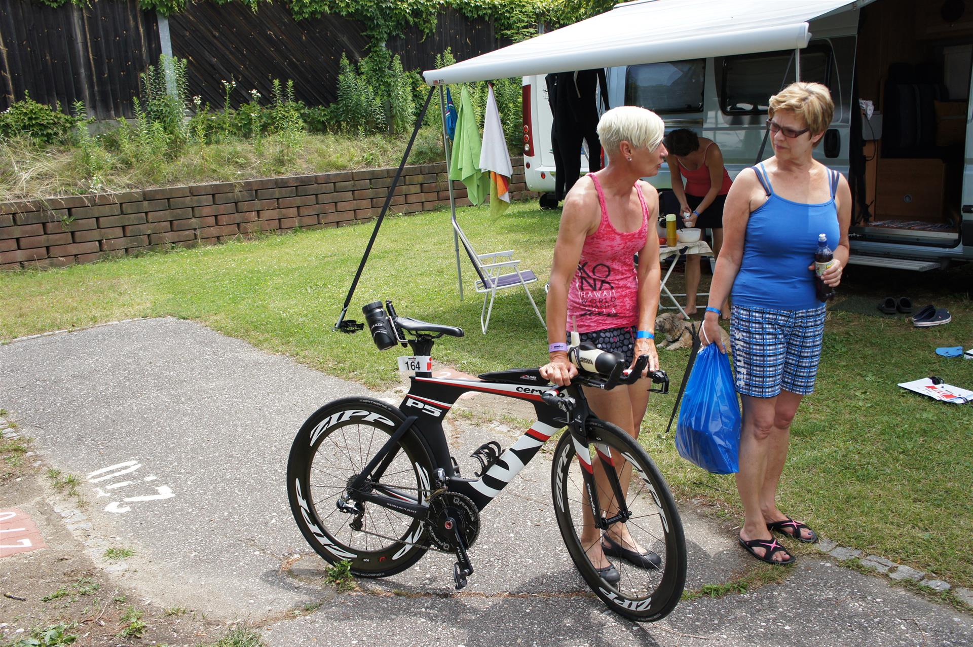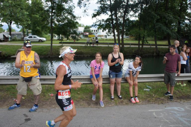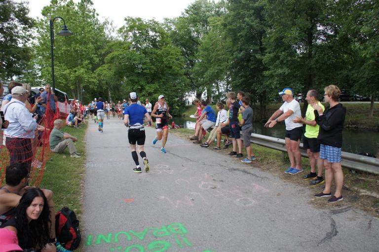 Als nächste Etappe steht dann der Anstieg zum Rupertiberg an. Der Anstieg ist etwas 2.400 Meter lang bei einer Steigung von bis zu 16 %. Auch hier haben sich sehr viele Zuschauer versammelt, das Anfeuern spornt die Athleten zu Höchstleistung an. Die letzten Kilometer der ersten Runde geht es dann überwiegend nur noch nach unten. Auf der zweiten Radrunde regnet es leider etwas, aber egal, da fährt man einfach etwas vorsichtiger. Nach 5:50 Stunden steige ich vom Rad und ziehe meine Laufschuhe an.