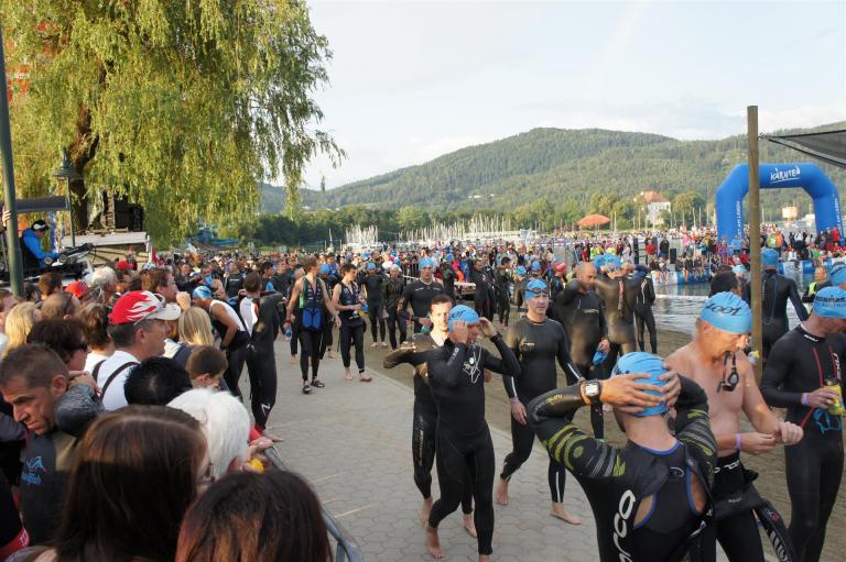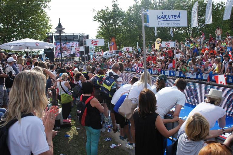 Obwohl ich lediglich eine mittelmäßige Schwimmerin bin macht mir das Schwimmen Spaß. Ich versuche meinen Rhythmus zu finden und gehe möglichst allen Konfrontationen aus dem Weg. Das Schwimmen im Wörthersee ist schon eine tolle Sache. Das Wasser ist super klar, die Strecke gut gekennzeichnet. Lediglich die letzten 1.000 Meter im Lendkanal sind etwas stressig. Wenn sich der ganze Pulk in den lediglich 10-12 Meter breiten Kanal zwängt. Da gibt es auf den ersten Metern ein ganz schönes Gedränge. Man wird jedoch durch die vielen Zuschauer am Rande des Kanals entschädigt. Die Stimmung ist gewaltig, der Krach ohrenbetäubend.