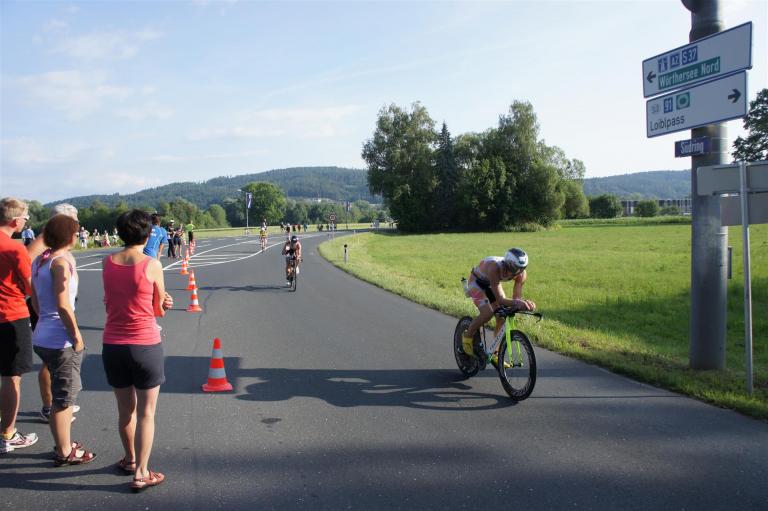 In der Wechselzone schnell die Radutensilien anziehen und ab aufs Rad. Es geht erst einmal Richtung Station bevor man dann am Wörthersee entlang fährt. Die ersten Kilometer ist die Radstrecke noch relativ voll. Das Feld muss sich langsam auseinander ziehen.