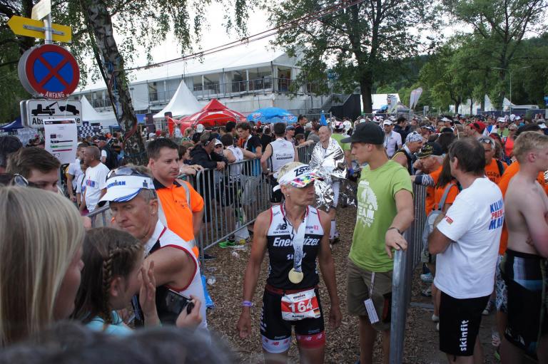 Nach einer Schwimmzeit von 1 Stunde und 11 Minuten verlasse ich das Wasser. Ich bin zufrieden mit meiner Zeit. Der Weg vom Schwimmausstieg bis in die Wechselzone ist relativ lange. Man hat ausreichend Zeit den Neoprenanzug etwas auszuziehen.