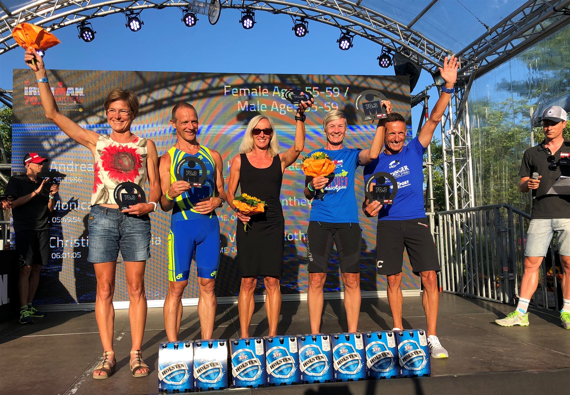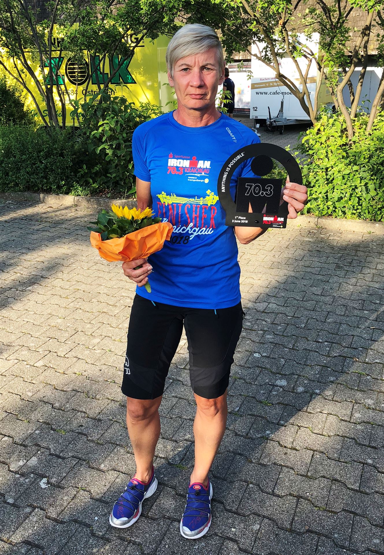 Mit diesem Platz war für mich klar, ich muss Gas geben. Trotz Hitze versuchte ich ein konstantes und zügiges Tempo zu laufen. 3 Runden a 7 Kilometer mit einigen kleinen Anstiegen und viel Sonne. Bei Temperaturen um die 30 Grad war man um jede Abkühlung dankbar. Einige Anwohner standen mit dem Gartenschlauch an der Strecke und gaben den Athleten die Möglichkeit sich etwas abzukühlen. Den Halbmarathon konnte ich in einer Zeit von 1:45:33 laufen. Nach insgesamt 5:33:56 ging ich nach einem tollen Wettkampf und einem 1. Platz in der AK 55 durchs Ziel. Ich hatte nicht damit gerechnet, solch eine Platzierung zu erreichen. Jetzt gibt es einige Tage lockeres Training und dann geht es zum Endspurt für die Langdistanz. Das teilweise sehr harte Training der letzten Wochen und Monaten hat sich definitiv bereits jetzt gelohnt.