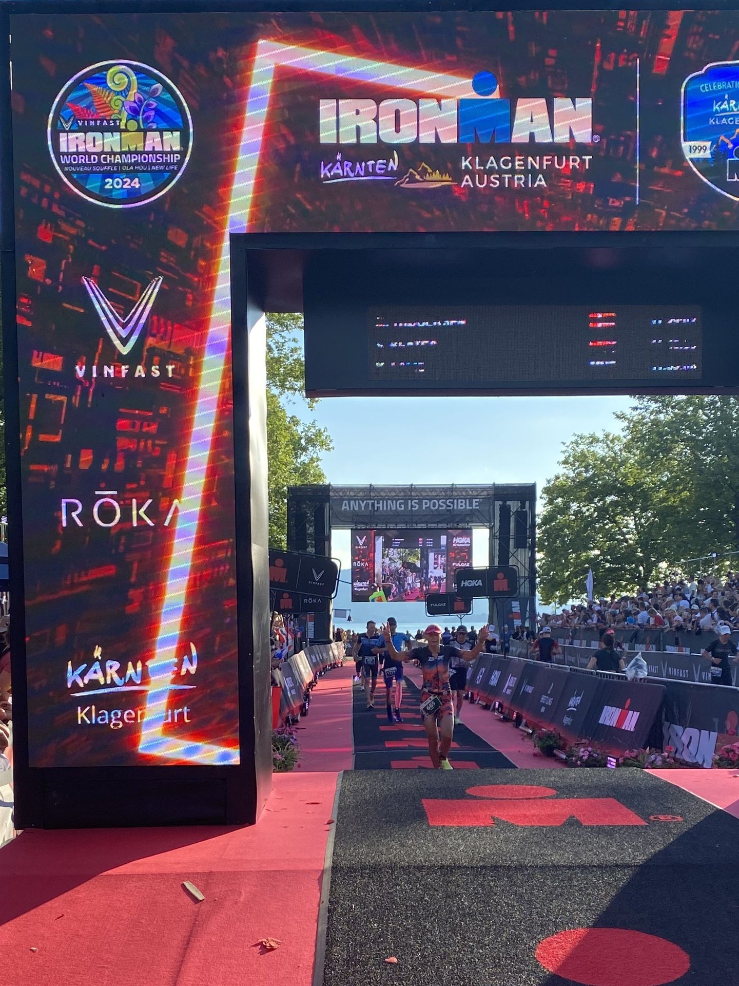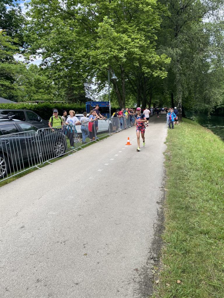Ab in die Wechselzone und die Radschuhe mit den Laufschuhen tauschen. Aufgrund der Temperatur entscheide ich mich, mein Trikot anzulassen. Ich gehe als erste Frau in meiner AK mit einem Vorsprung von circa 18 Minuten auf die Laufstrecke. Nach dem ersten Kilometer geht es mir nicht so gut, ich fühle mich schlapp. Das kenne ich überhaupt nicht von mir. Anscheinend habe ich auf dem Rad nicht ausreichend gegessen. Normalerweise kann ich nach dem Rad direkt ohne Probleme los laufen, dieses Mal habe ich Probleme. Ich entscheide mich bis zur ersten Verpflegungsstelle Gehpausen einzulegen. An der ersten Verpflegungsstelle bin ich vorbei gelaufen, keine Ahnung weshalb. Das ist Wettkampf, da passieren solche Dingen. Bei der 2. Verpflegungsstelle nehme ich mir etwas Zeit und esse und trinke ordentlich. Danach geht es mir viel besser. Nach den ersten 10 Kilometern konnte ich meinen Vorsprung auf die Zweite bereits etwas ausbauen. Ich halte bei jeder Verpflegungsstelle an und nehme Flüssigkeit bzw. Gel zu mir. Der Vorsprung wird immer größer. Werner hält mich auf dem Laufenden. Ab circa Kilometer 32 habe ich Probleme mit der Verpflegung. Ich kann nichts mehr aufnehmen, mein Magen rebelliert. Ich entscheide spontan, dass ich es mit Cola probiere. Die Strategie geht auf, mein Magen rebelliert nicht mehr. Da ich bereits einen Vorsprung von über 45 Minuten auf den letzten 10 Kilometern habe gehe ich auf Nummer sicher. Ich nehme nur noch Cola zu mir und lege die ein- oder andere Gehpause ein. Ich bin zuversichtlich als Erste ins Ziel zu kommen. Bei Kilometer 39 bin ich schon leicht euphorisch, laufe jedoch weiter verhalten. Kein unnötiges Risiko eingehen. Bei Kilometer 41 fange ich an innerlich zu jubeln. Auf dem letzten Kilometer sind alle Probleme vergessen, es geht in Richtung Ziel. Der Zieleinlauf ist für jeden Athleten etwas Besonderes. Direkt im Ziel wartet bereits Werner auf mich und überreicht mir die Finisher Medaille. Das ist ein toller Moment. Natürlich habe ich, wie immer, vergessen auf meine Endzeit zu schauen. Wichtig für mich ist, ins Ziel zu kommen. Natürlich freut man sich, wenn dann noch eine gute Zeit bzw. Platzierung raus komm. Den Marathon bin ich in einer Zeit von 4:13:33 gelaufen. Meine Gesamtzeit beträgt 11:51:30 Stunden. Wahnsinn, ich bin total begeistert mit dieser Zeit gefinisht zu haben. Die Zweite in meiner AK kommt erst 1:17 Stunden nach mir ins Ziel. Es ist toll wieviel Zeit ich noch rauslaufen konnte. Es war wieder ein tolles Erlebnis in Klagenfurt und ich bin dankbar bei diesem Jubiläum dabei sein zu können. Nach dem Wettkampf gibt es noch eine Woche Urlaub und Erholung, danach geht der Focus auf die Weltmeisterschaft in Nizza.