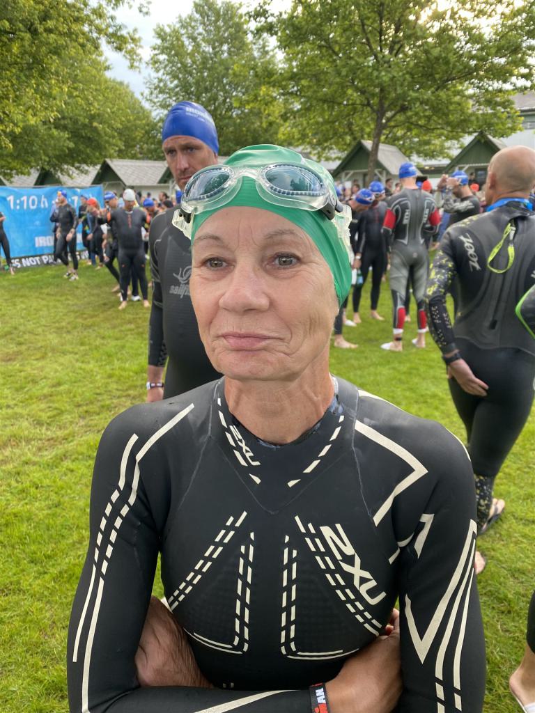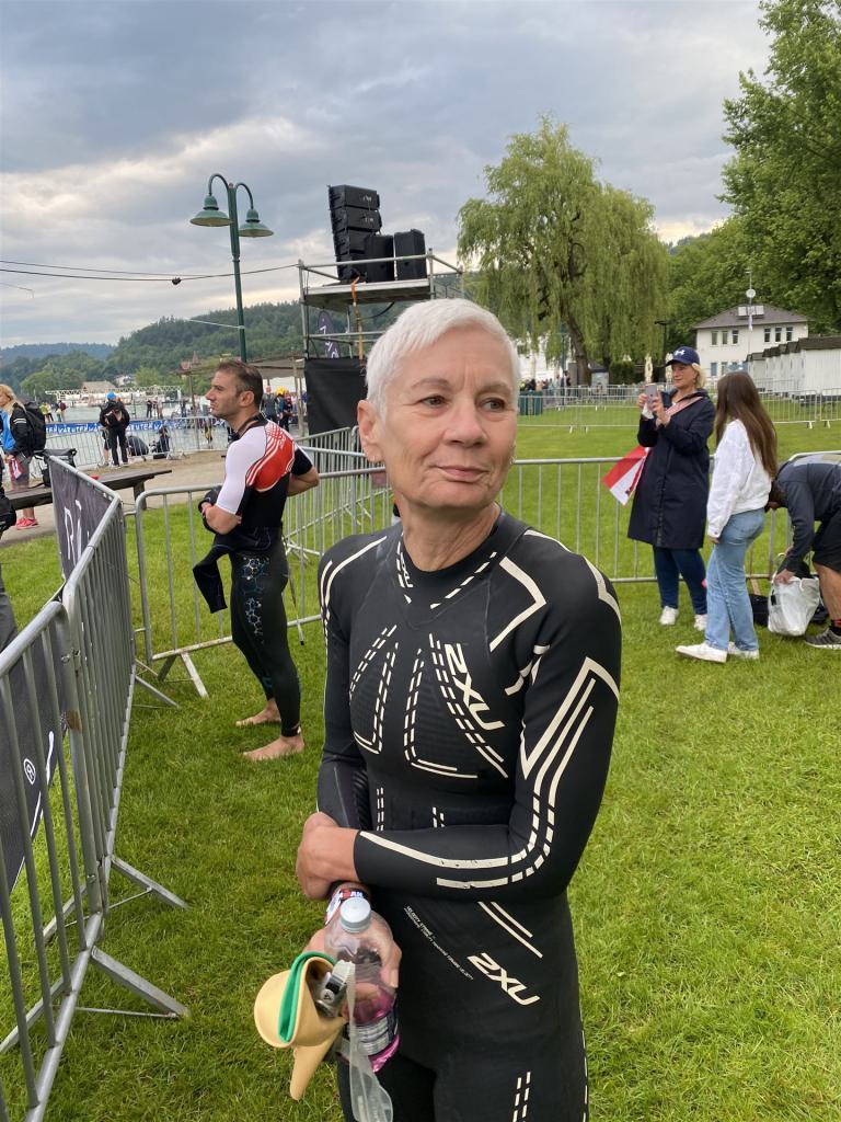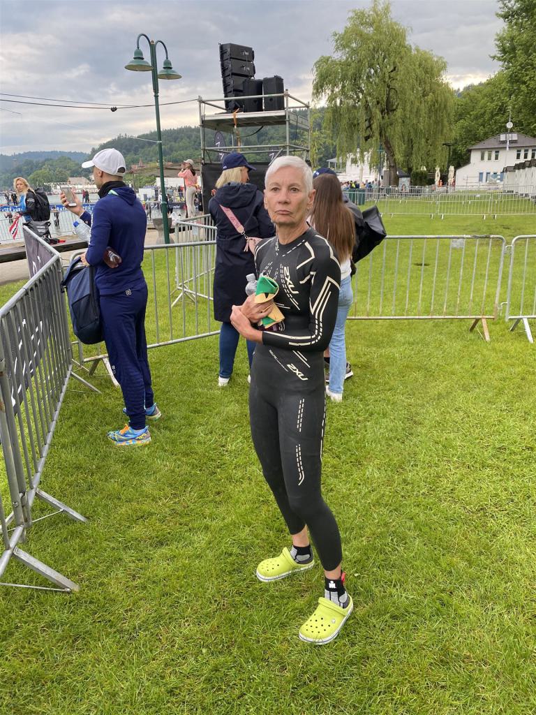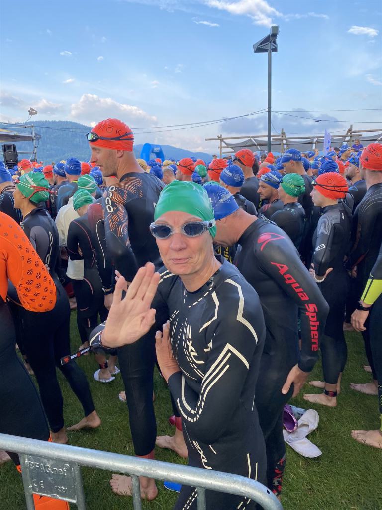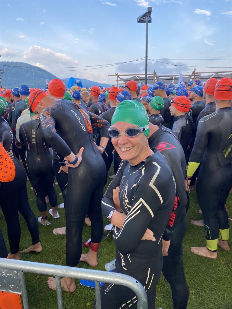 Geschwommen werden die 3,8 Kilometer im Wörthersee. Der See hat Trinkwasserqualität und ist relativ klar. Gestartet wird in Gruppen, man ordnet sich entsprechend der voraussichtlichen Schwimmzeit in eine Gruppe ein. Die Profimänner starteten um 6:30 Uhr, es gab keine Profifrauen. Ab 6:40 Uhr gingen die Agegrouper ins Wasser. Da ich keine Uhr beim Wettkampf trage konnte ich nicht einschätzen, wie lange es gedauert hat, bis ich ins Wasser konnte. Alle 5 Sekunden gingen 4 Athleten ins Wasser. Das Schwimmen war relativ entspannt, ich wurde nicht oft überholt und habe auch wenige Athleten überholt. Ich denke, die meisten Athleten haben sich korrekt eingeordnet. Der erste Streckenabschnitt klappt super, ich kann die Bojen sehr gut erkennen. Beim Rückweg in Richtung Lendkanal hatte ich leichte Schwierigkeiten mit den Bojen. War aber nicht schlimm für mich, ich habe mich an den anderen Athleten orientiert. Den Eingang zum Lendkanal konnte ich nicht erkennen, ohne Brille und dann noch direkt die Sonne, da habe mich absolut auf die anderen verlassen. Erstaunlicherweise hielt sich das Gedränge im Lendkanal auch in Grenzen, ich hatte mich Mental auf dichtes Gedränge und evtl. auch Schläge eingestellt. Nichts davon ist passiert. Das Schöne an diesem Kanal sind die Zuschauer auf beiden Seiten, die Stimmung ist super. Der Schwimmausstieg ist am Parkhotel, die Strecke bis in die Wechselzone ist relativ lang. Ich komme als 2. Frau in meiner AK aus dem Wasser. Mit meiner Schwimmzeit von 1:19:50 bin ich zufrieden.