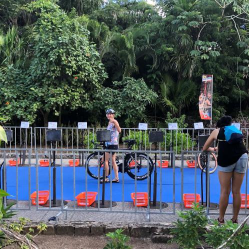 Man kann nachts relativ gut schlafen, die Temperaturen sind angenehm. Wir sind heute früh auf. Heute steht die erste Radeinheit auf dem Plan. Wir fahren einen Teil der Wettkampfstrecke ab. Es ist sehr windig, da muss man stellenweise aufpassen. Nach ein paar Kilometern hat man sich daran gewöhnt. Unterwegs trifft man einige Athleten. Direkt am Meer ist der Wind ganz schön arg. Die Landschaft ist toll, alles grün. Sehr wenig Autoverkehr. Nach dem Rad gibt es noch einen Koppellauf, inzwischen ist es gut warm. Das Meer ist heute auch sehr wellig und aufgewühlt. Es hängt die rote Fahne. Zum Mittagessen sitzen wir mit Blick aufs Meer im Beachrestaurant. Das ist Urlaub. Am Abend probieren wir die internationale Küche in einem weiteren Spezialitätenrestaurant aus. Tolles Essen, super Ambiente und ganz tolle Bedienung. Nach einem kleinen Absacker geht es Richtung Zimmer bzw. Bett. Ach übrigens, hier gibt es ganz viele Nasenbären, sehr zutraulich. Man muss aufpassen, die kommen ins Zimmer.